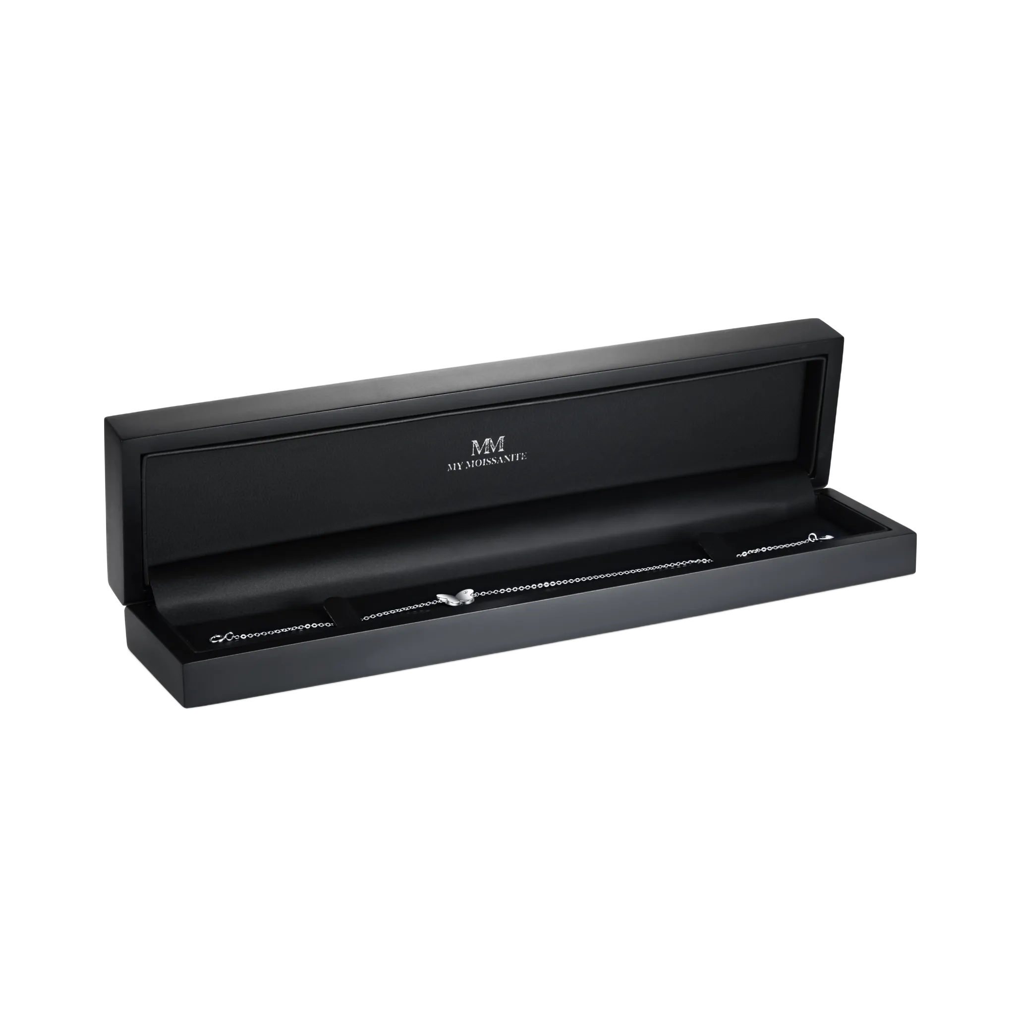 Add a touch of whimsy to your look with the Papillon. This moissanite butterfly charm bracelet features an enchanting butterfly with a sparkling moissanite stone on its wing. Elegantly crafted with an adjustable link chain ending in a secure lobster clasp, this bracelet stretches from 16 to 21 cm to fit your wrist perfectly. Pair it with our Butterfly Beauty or Butterfly Drops earrings for a cohesive style.