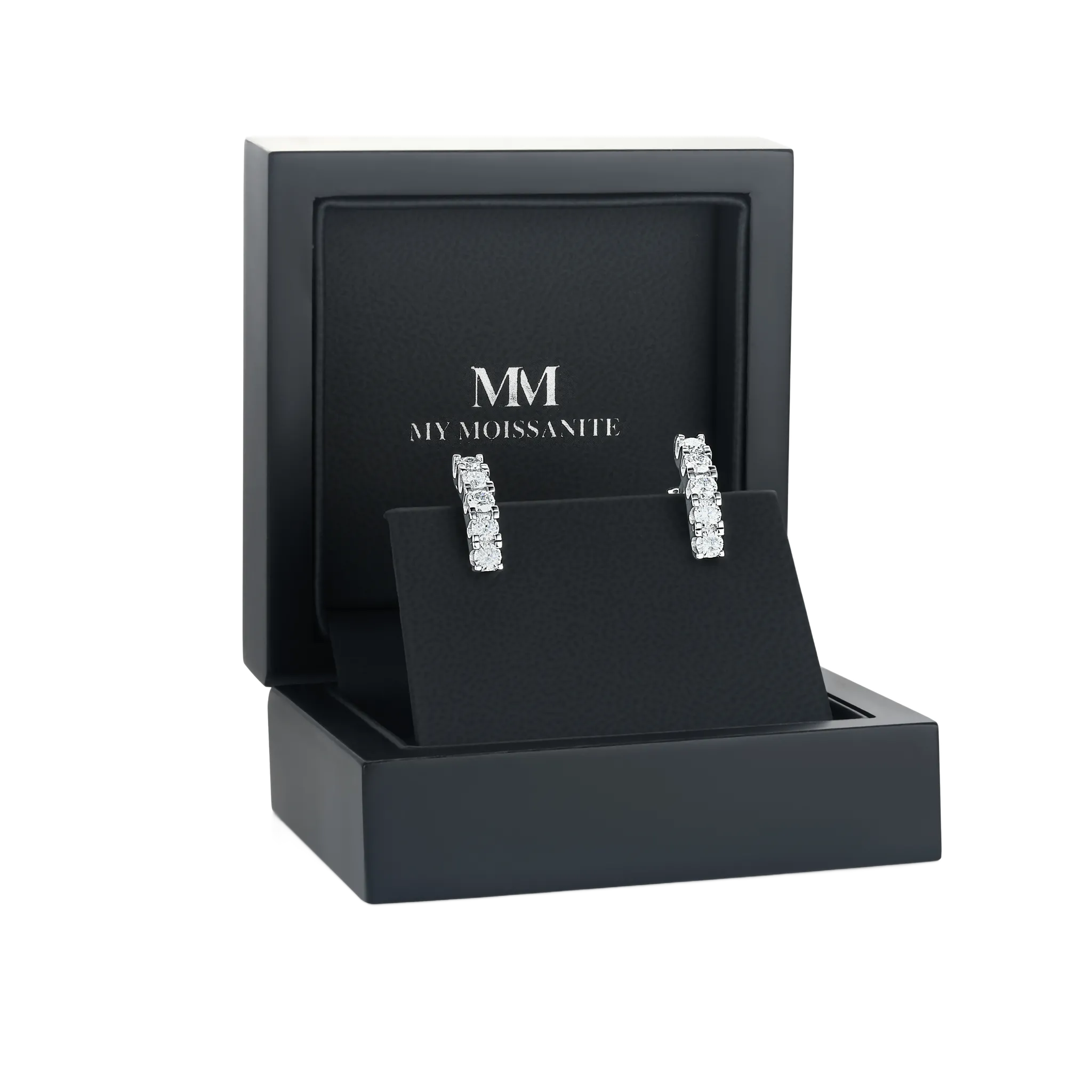 Introducing Cascade, a pair of linear moissanite hoop earrings, expertly crafted to highlight the brilliance of each stone. These elegant earrings feature a symmetrical design with ten perfectly aligned round-cut moissanites, set in a shared prong setting for enhanced sparkle. The secure hinged fastening ensures comfortable wear, making Cascade suitable for both casual and formal occasions.