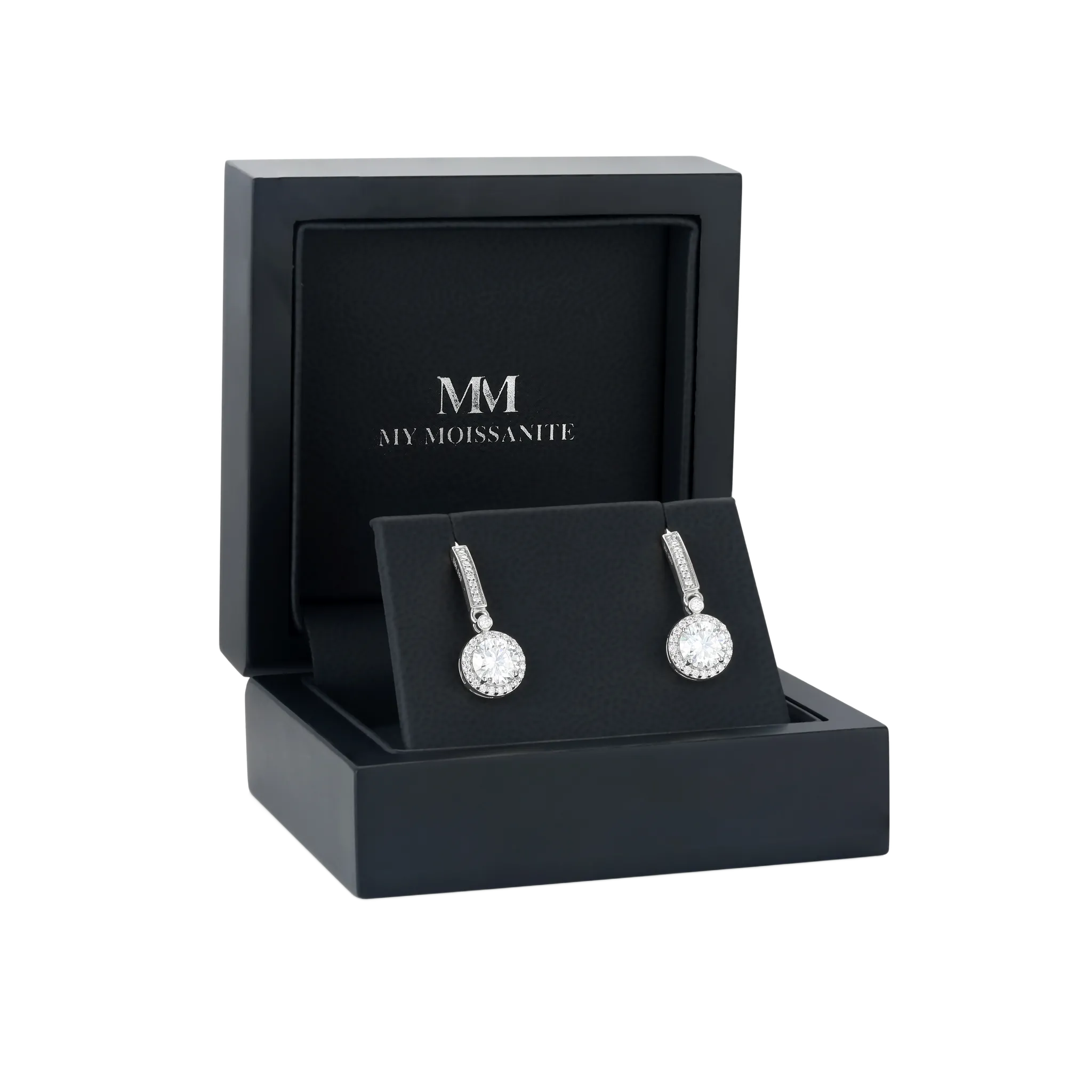 Add a dose of glamour to your style with the Luminary Moissanite Halo Drop Earrings. Featuring a central 1 carat (6.5 mm) moissanite stone surrounded by a halo of sparkling smaller moissanites, these earrings are the perfect accessories to brighten your look for any occasion. Whether you're celebrating a special event, looking for a great gift or want to spice up your everyday outfit, the Luminary earrings are a great choice.