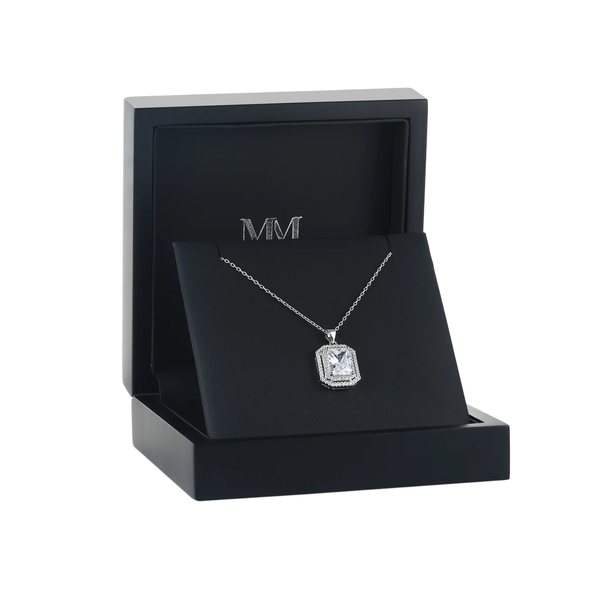 The Cristallo captures the essence of sophistication with a radiant cut moissanite, embraced by a double halo of pavé-set round moissanite stones. This exquisite pendant necklace features a link chain, meticulously designed for a graceful finish. Ideal for elegant ensemble enhancement, it pairs seamlessly with our Aura earrings for a cohesive, refined look.