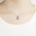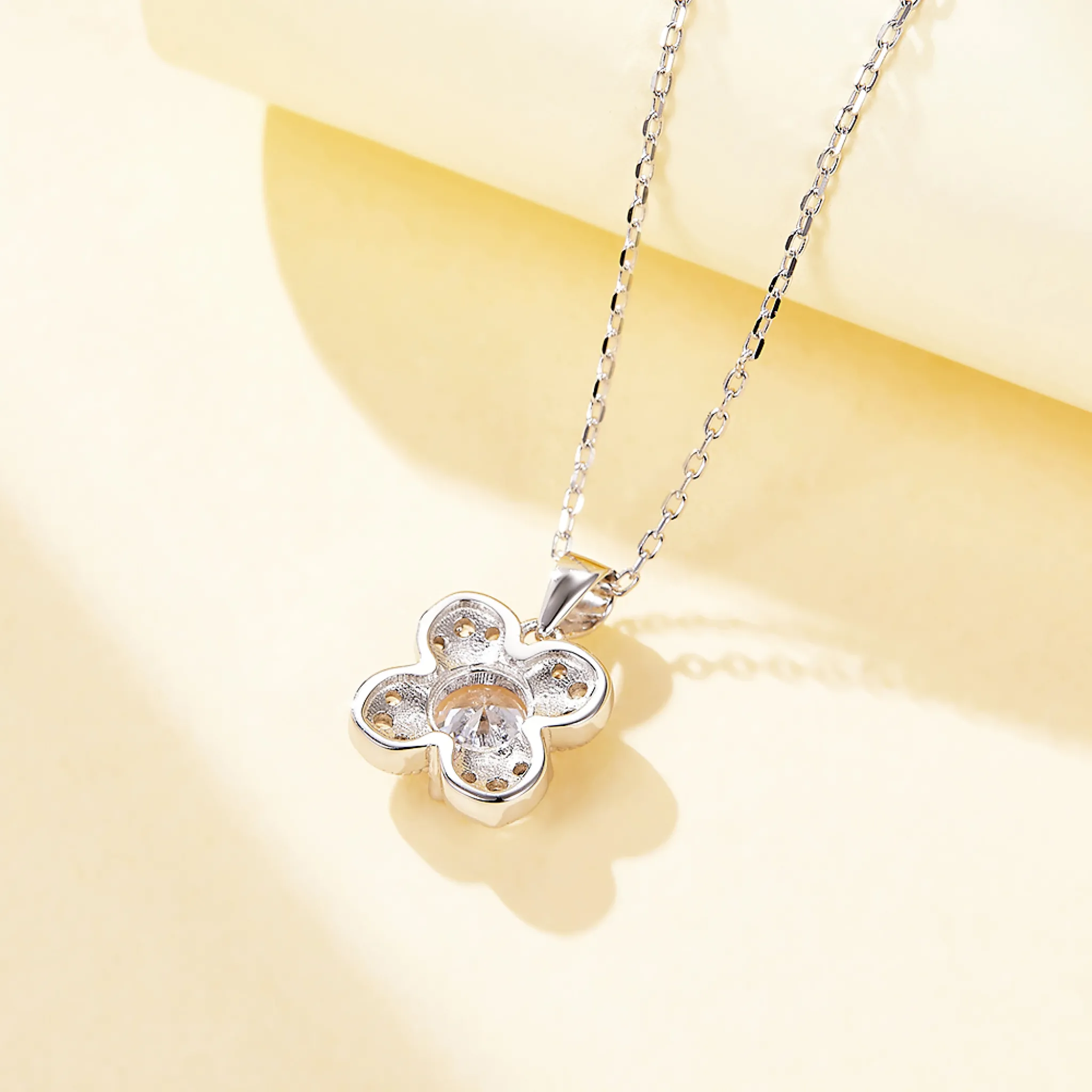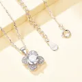 The Flora pendant captures the enchanting allure of a four-leaf clover, a symbol of good fortune, meticulously crafted to showcase a scintillating 1 carat moissanite centerpiece. The surrounding pavé accents, intricately set, add a radiant sparkle that complements the central stone. The design, both intricate and harmonious, hangs gracefully from a 40+5 cm necklace, ensuring it sits perfectly against the collarbone. With each movement, this pendant reflects light in a symphony of brilliance, making it a captivating addition to any ensemble.