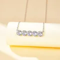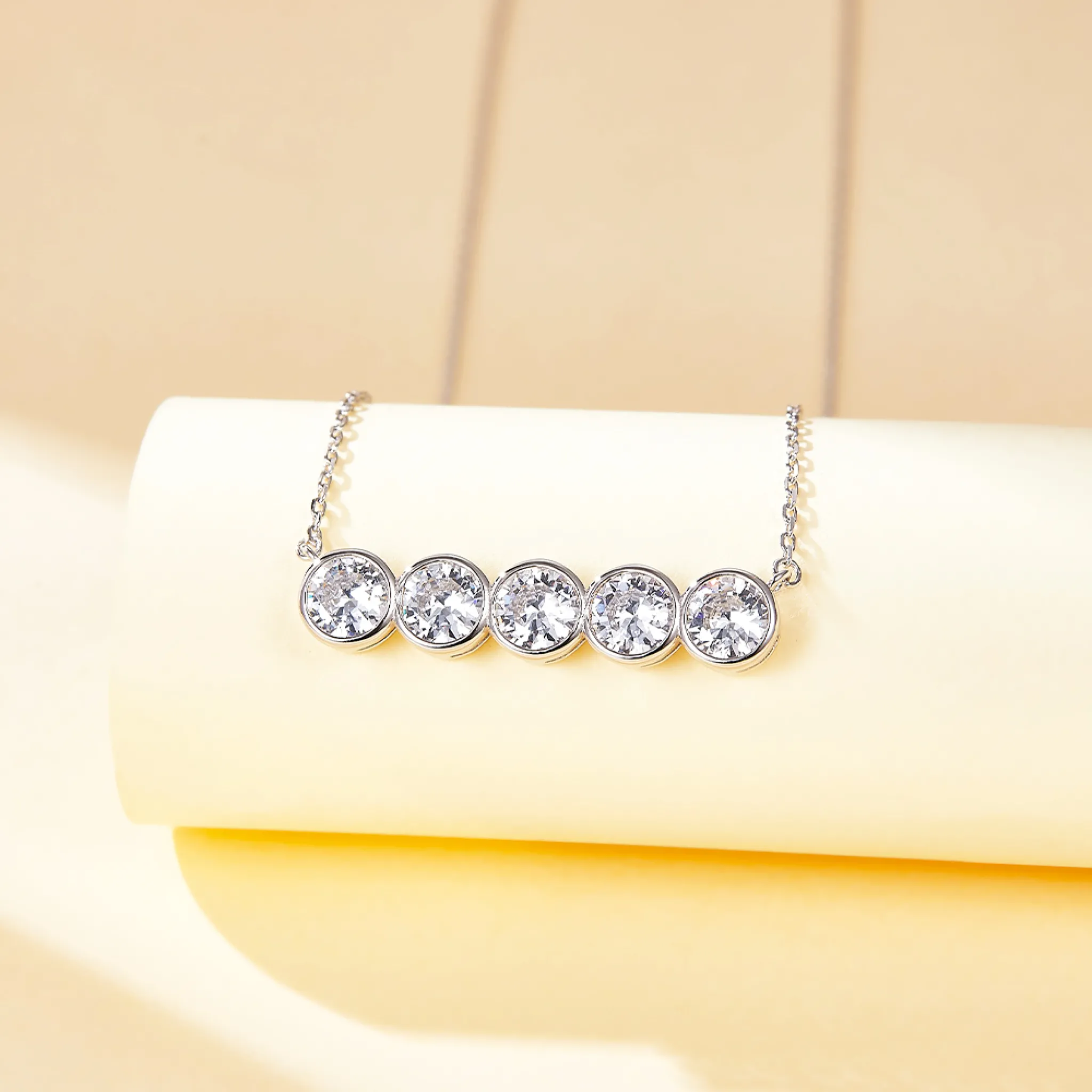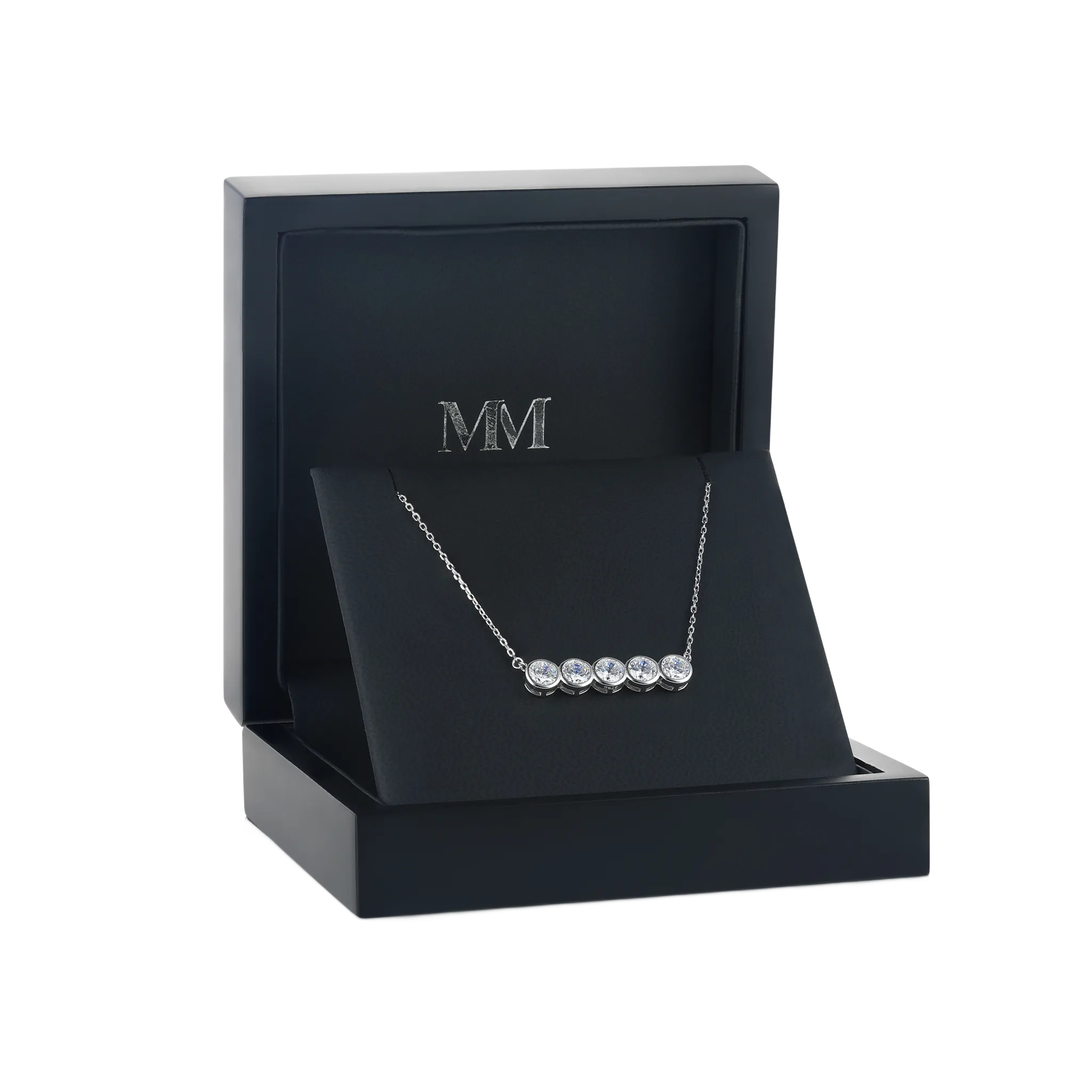 The Quinta necklace is a study in minimalist charm, presenting five exquisitely cut moissanite stones nestled in a secure bezel setting. This piece features an adjustable 40+5 cm chain, ensuring a perfect fit for any neckline. Each stone is masterfully aligned, creating an elegant cascade that draws the eye. Designed to complement the Tri-Bezel earrings, this necklace forms part of a sophisticated ensemble. The precision of the stones’ placement is mirrored by the delicacy of the chain, making the Quinta an embodiment of refined craftsmanship and style.