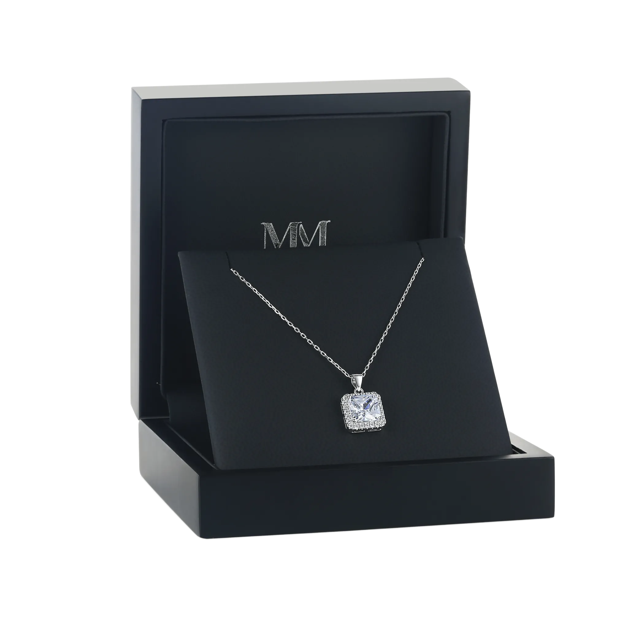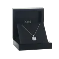 Introducing Radiance, a princess cut halo moissanite pendant that exudes elegance and brilliance. The captivating center stone is encircled by a halo of meticulously placed smaller moissanite stones. This arrangement not only emphasizes the central gem's radiance but also lends a classic silhouette to the pendant. Set in a secure prong setting for enhanced light exposure, the pendant dangles gracefully from a chain of optimal length, ensuring it sits perfectly around the wearer’s neck.