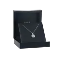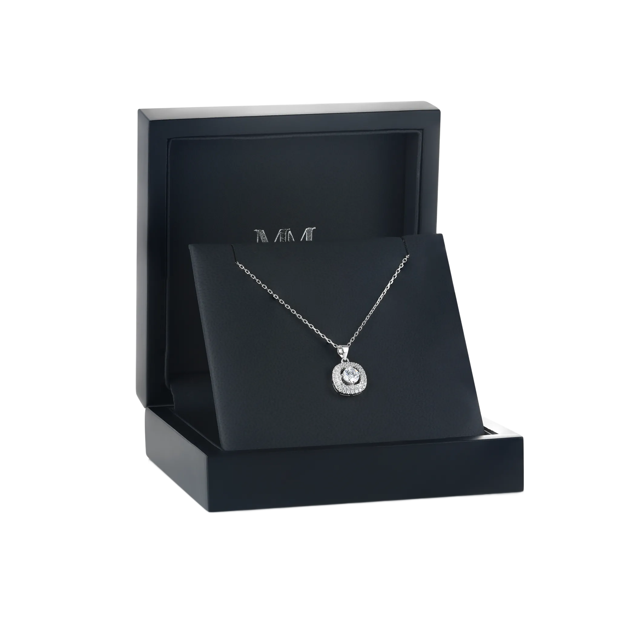 The Vivara pendant presents a dazzling display with a 5mm moissanite center stone surrounded by an encrusted halo of 44 precision-set 1.1mm stones. The piece captures the essence of sophistication, offering a resplendent sparkle that draws the eye. This pendant is designed to showcase the moissanite's signature brilliance in a setting that is both graceful and striking. The necklace displayed in the images is included, featuring an adjustable length of 40 cm with an additional 5 cm extension.