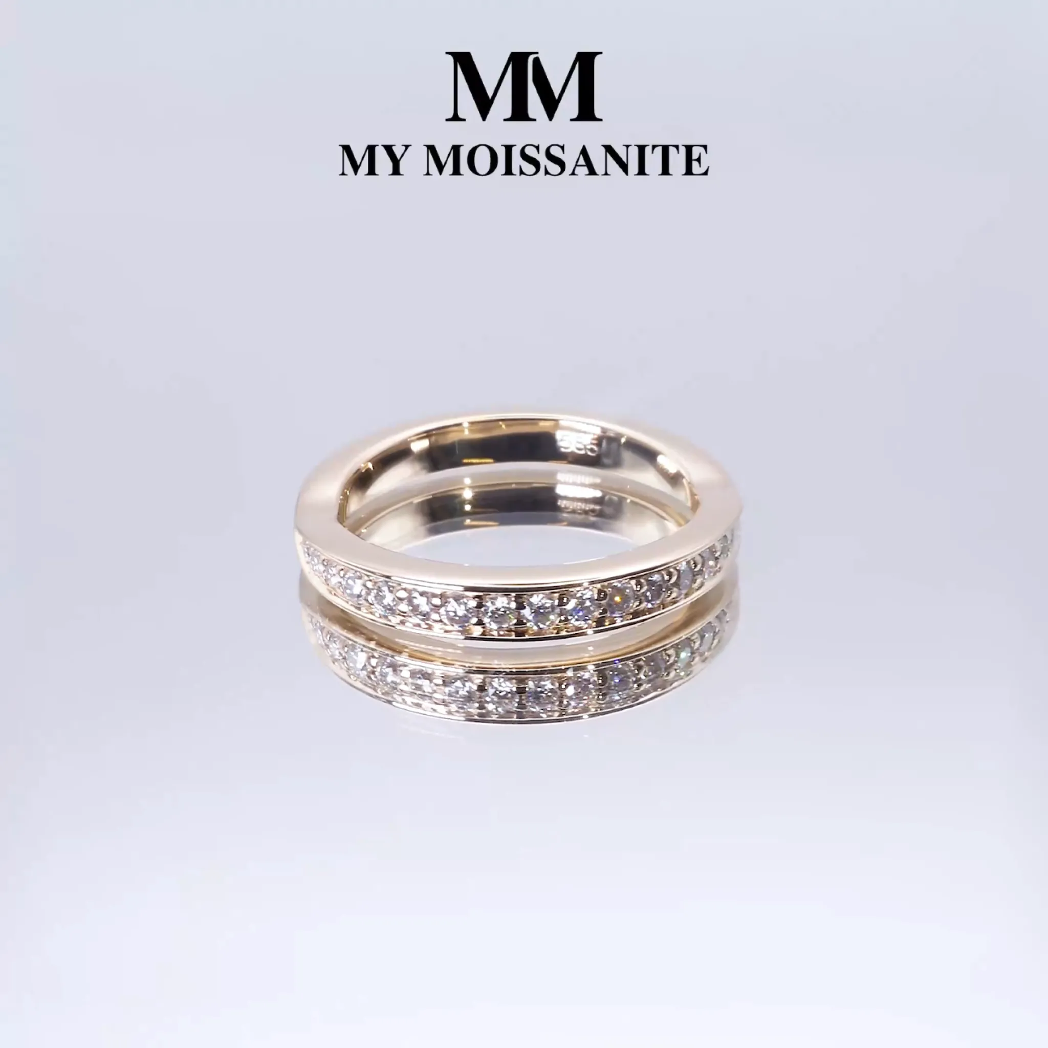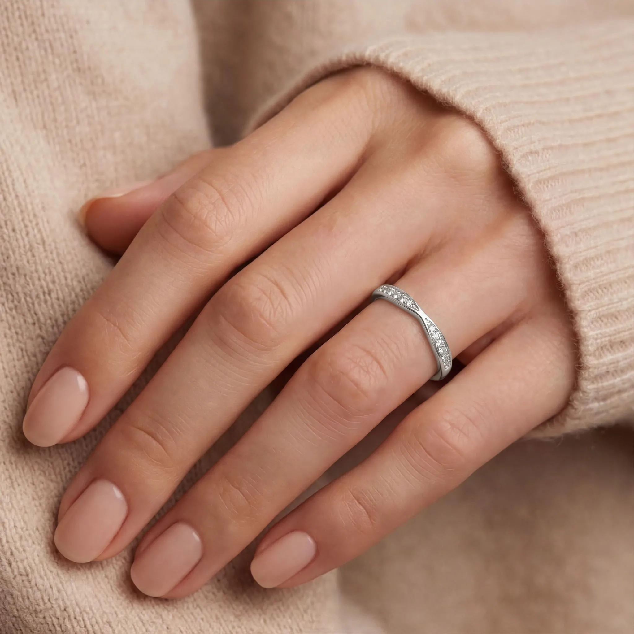 The Aria features a curved moissanite wedding band with a pavé setting, highlighting the brilliance of round-cut moissanite stones closely set to create continuous sparkle. The elegant wave-like design makes it perfect for pairing with engagement rings or wearing alone. Enhanced by different sizes of moissanite stones, the Aria captures attention with its exceptional brilliance and sophisticated style.