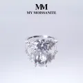 The Astral features a round moissanite center stone in a prong setting, enhancing its brilliance through maximum light entry. Six smaller moissanite side stones, arranged in a three-stone pattern on each side, accentuate the center stone. The ring's smooth, slightly tapered design merges seamlessly with the prong settings. Combining classic elegance and a striking profile, this moissanite engagement ring showcases its stones prominently.