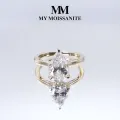 The Poirine ring features a stunning pear-cut moissanite at its center, held securely in a three-prong setting. The split shank design is adorned with pavé accent stones of varying sizes, creating a dazzling effect. Hidden beneath the main moissanite is a hidden halo, adding an extra layer of brilliance. The ring's build offers both visual appeal and durability, making it a perfect moissanite engagement ring option.