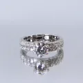 Encircling the central stone are meticulously arranged pavé side stones, set in a stunning double formation. These smaller gems enhance the round moissanite's glow, creating a symphony of sparkle that's simply irresistible.