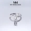 The Veridian is an exquisite emerald cut moissanite engagement ring, replete with a pavé-set band that wraps the entirety with shimmering round side stones. Its four-prong setting perfectly cradles the central moissanite, enhancing its brilliance without unnecessary adornments. The band's shoulders, lined with additional stones, complement the centerpiece, making it a symbol of elegance and sophistication. This moissanite ring promises beauty and durability, making it an ideal choice for a lifelong commitment.
